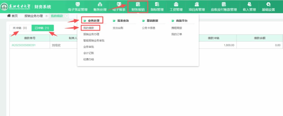 登录财务系统,在顶端标题行点击财务报销→业务处理→我的借款中查询未冲销的借款。