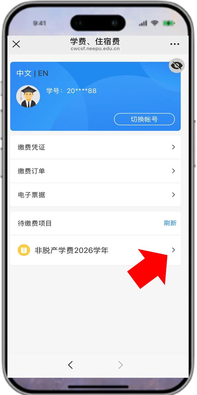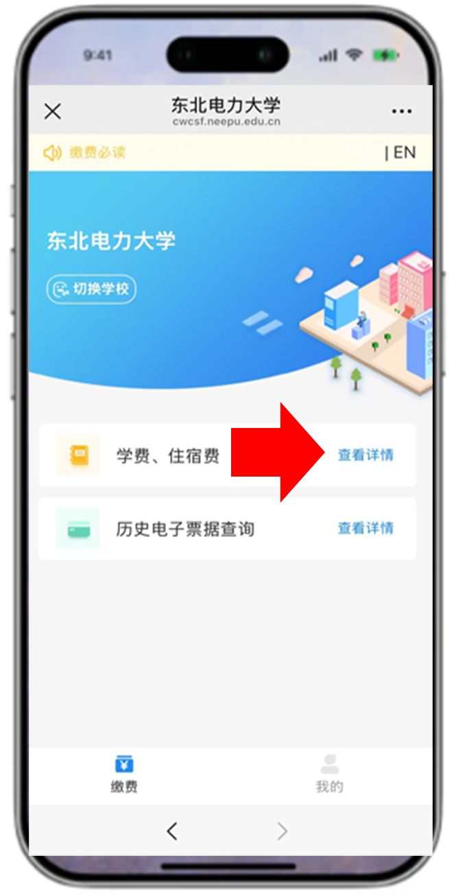 关注微信公众号打开手机的微信APP扫描下方二维码进入我校“东北电力大学计划财务处”微信公众号,点击底部菜单“在线缴费”➡️“学费宿费”进入,点击“学费、住宿费”。