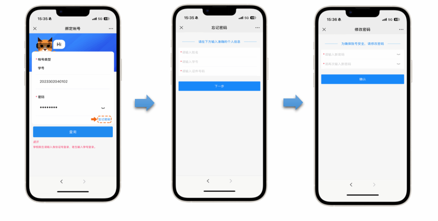 如果忘记自主设置的密码,请点击右下方的“忘记密码”进入修改密码页面,输入个人信息核验通过后,再设置新密码(支持8-30位密码) ,修改完成点“确认”即修改成功。