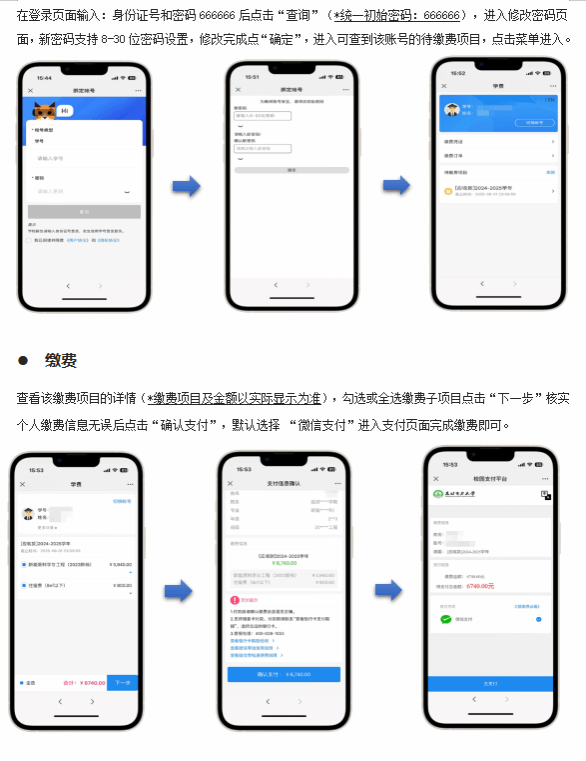 在登录页面输入:身份证号和密码666666后点击“查询”(*统一初始密码:666666),进入修改密码页面,新密码支持8-30位密码设置,修改完成点“确定”,进入可查到该账号的待缴费目,点击菜单进入。