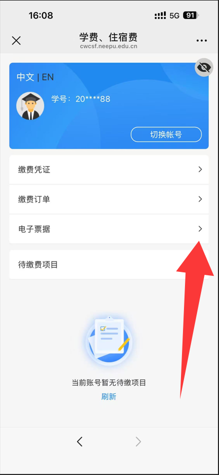 2.缴费经财务处对账后,学生在微信平台收到学宿费收据,学生下载到手机相册后永久保存。